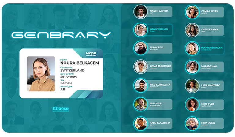 As you prepare to enter GENBRARY, you are greeted by Alexandra, a knowledgeable and graceful member of the HOPE Laboratory’s Public Relations team. With a calm and welcoming voice, she guides you through the process of finding your perfect match. Whether you choose to invite your real-life partner or select a donor from the Genetic Library, Alexandra provides you with the information and tools you need to make a thoughtful, informed decision. In this space of possibilities, she is your trusted guide—helping you take the next step toward building a future life with intention.